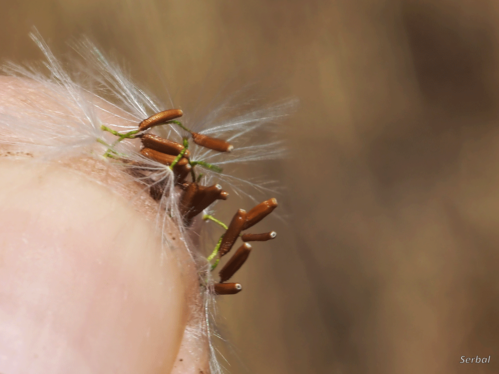 Las semillas son pardo claro, alargadas y con vilano plumoso blanco, son semillas desiguales dependiendo de su posición en la flor, son dispersadas por el viento.
