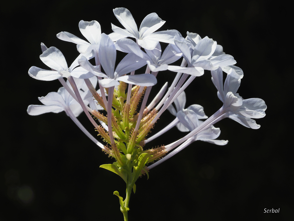 50-500 cm. Planta arbustiva de la familia Plumbaginaceae; es originaria de Sudáfrica y desde aquí se ha extendido como planta ornamental a gran parte del mundo; presente en las zonas cálidas de la Península Ibérica.