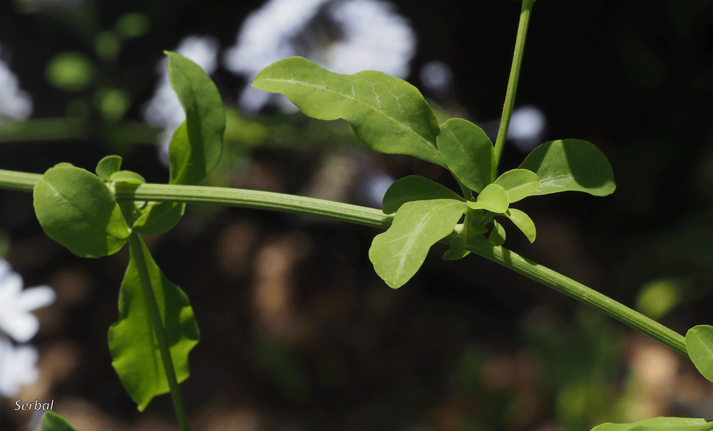 Las hojas son alternas de color verde intenso por el haz y con escamas blanquecinas por el envés, en la inserción de la hoja al tallo podemos ver una aurícula, sobre esta pueden emerger una o varias hojas, siendo estas desiguales; borde las hojas entero, aunque a veces pueden verse con una división en el tercio proximal, borde ondulado y forma general de la espatulada.