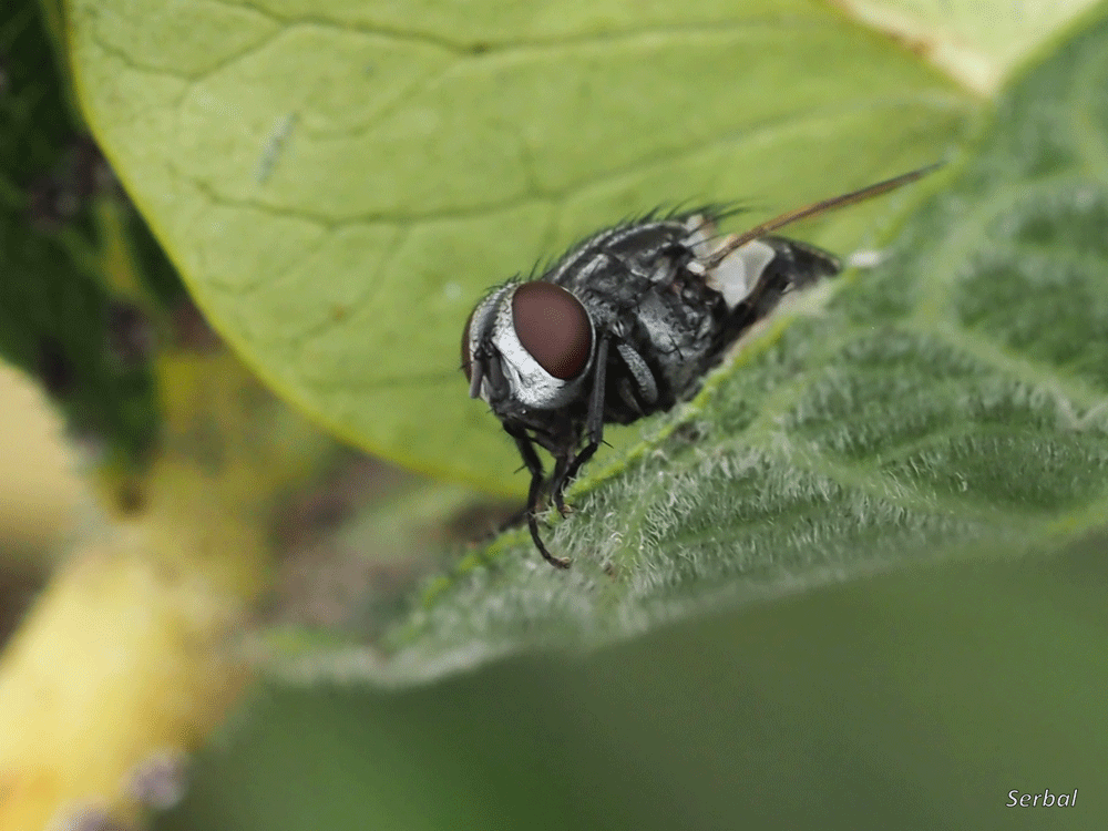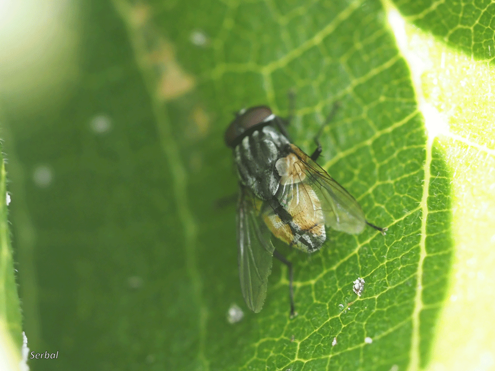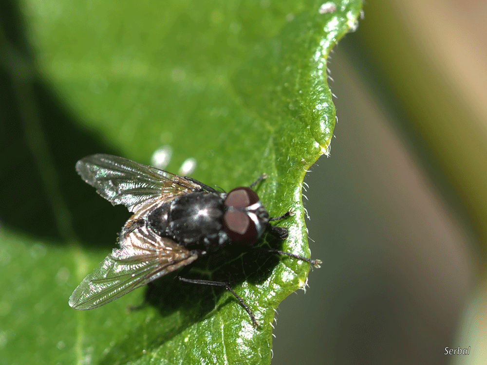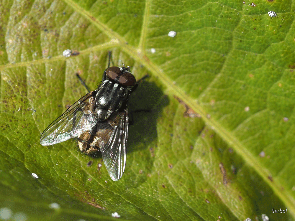 7-8 mm. Mosca de la familia Muscidae; común en la zona mediterránea, desde aquí se ha extendido a la mayor parte de las zonas de clima cálido del mundo, considerada hoy subcosmopolita; presente en toda la Península Ibérica.
