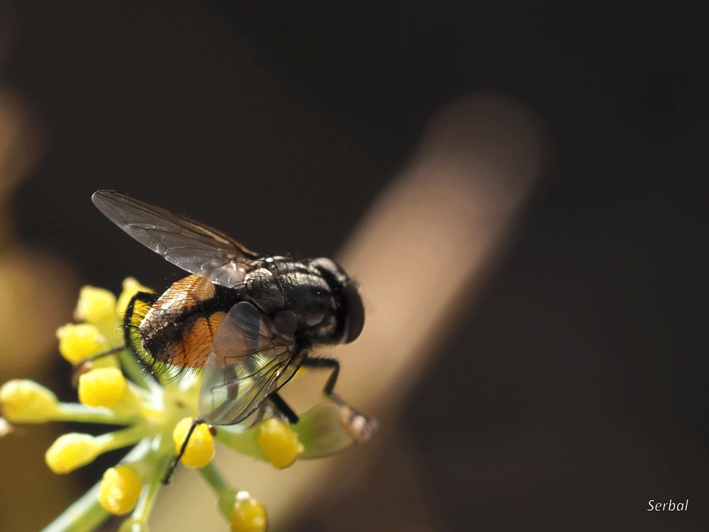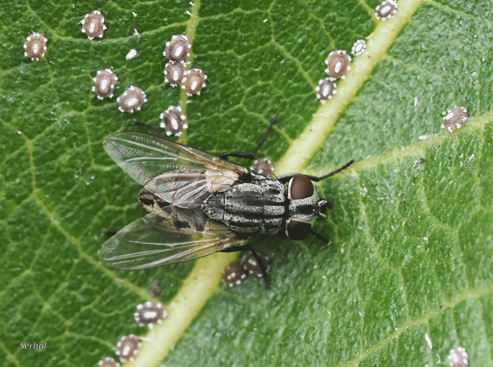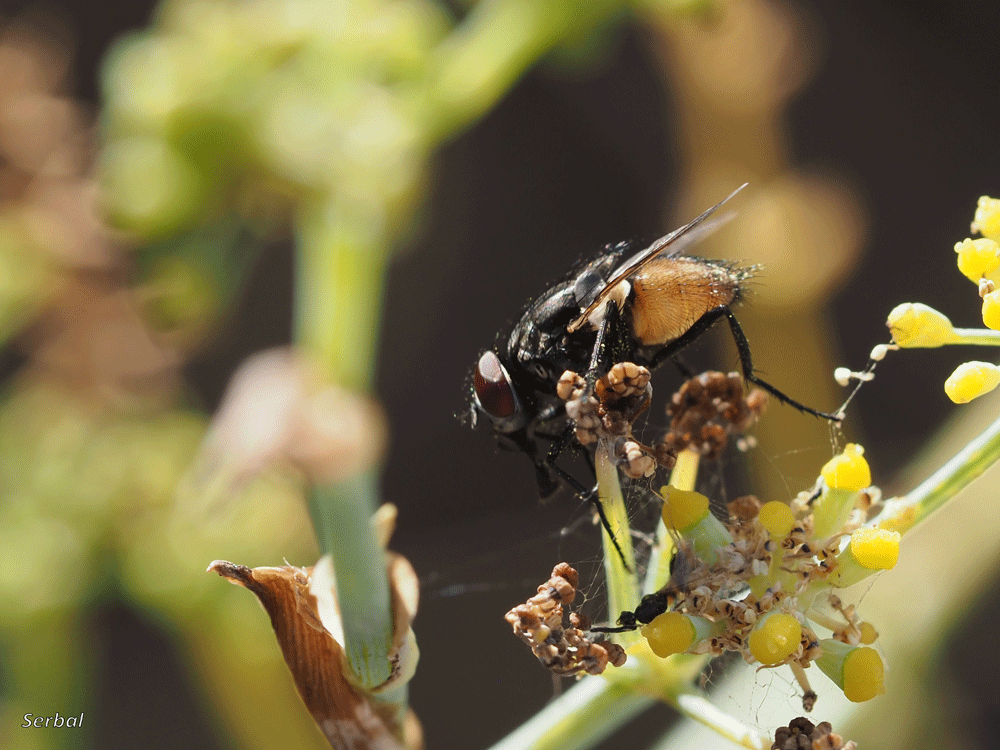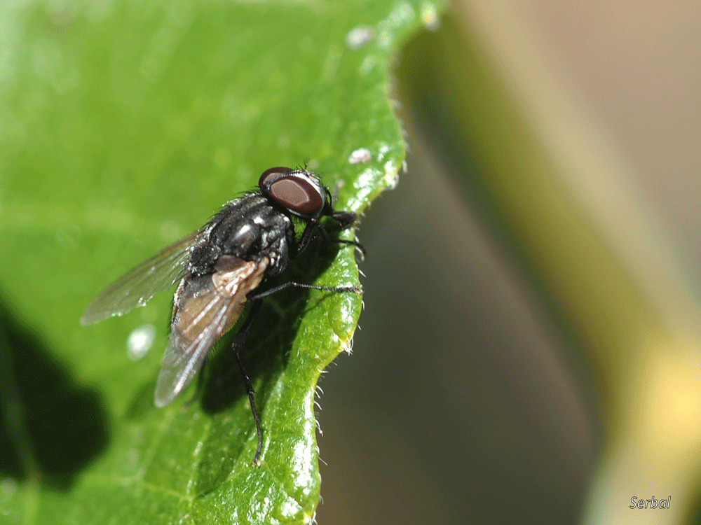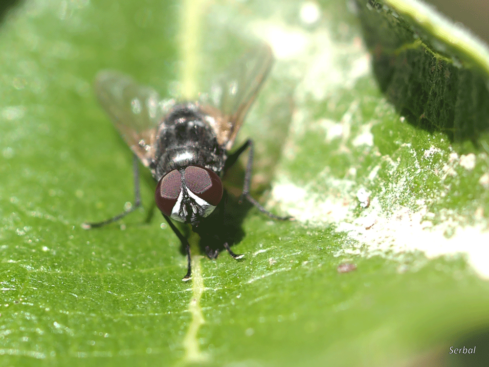 7-8 mm. Mosca de la familia Muscidae; común en la zona mediterránea, desde aquí se ha extendido a la mayor parte de las zonas de clima cálido del mundo, considerada hoy subcosmopolita; presente en toda la Península Ibérica.