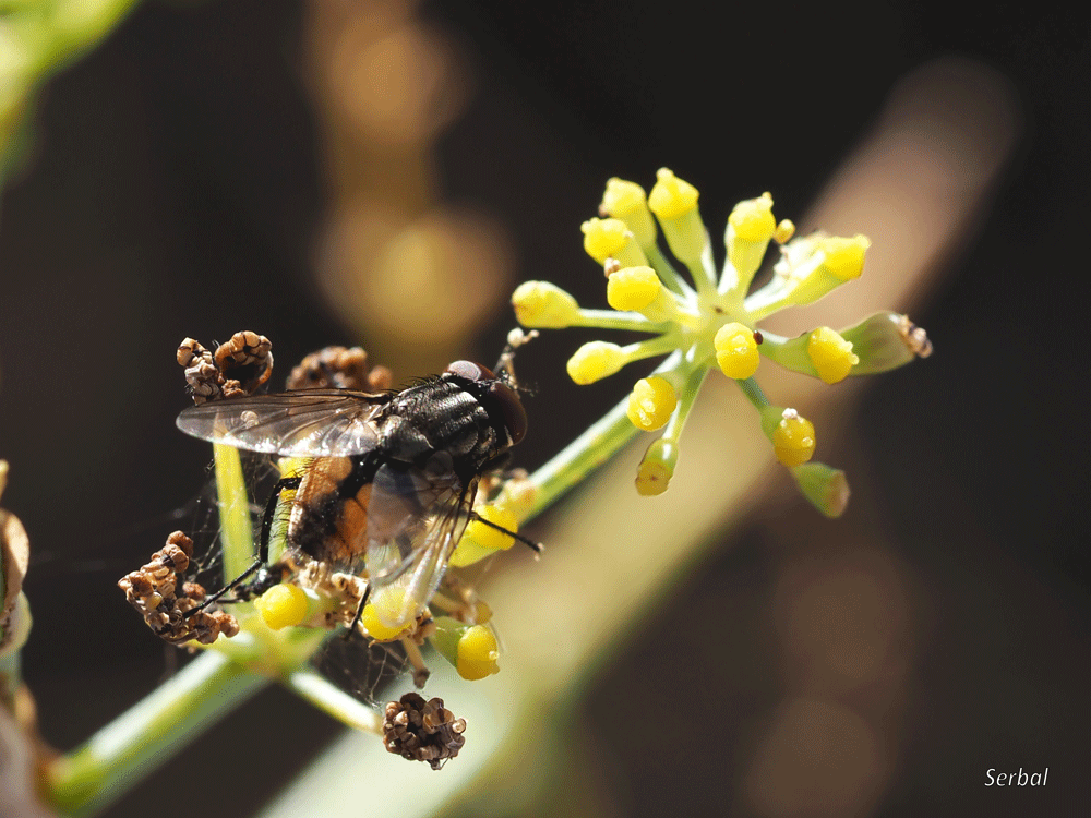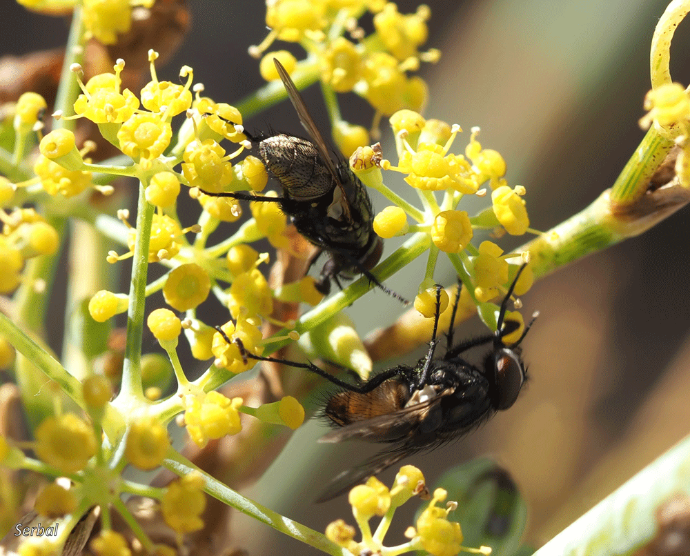 Se alimentan de secreciones de los ojos y nariz de los animales, especialmente vacas y caballos (Mosca de la cara), secreciones de las heces y de néctar de las flores.