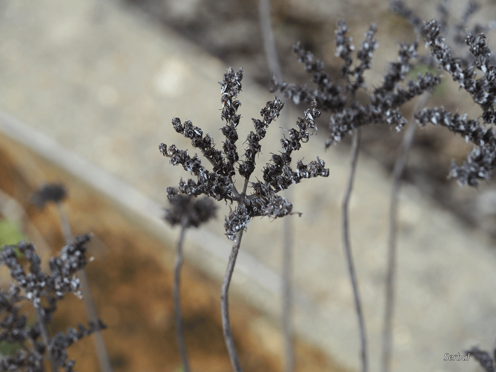 El fruto es una cápsula con pequeñas semillas diminutas dentro; las semillas son oblongas, pardo claro con ápice agudo y estilo persistente; tanto el escapo (tallo floral) como los radios con las flores secas o frutos, permanecen largo tiempo presentes.