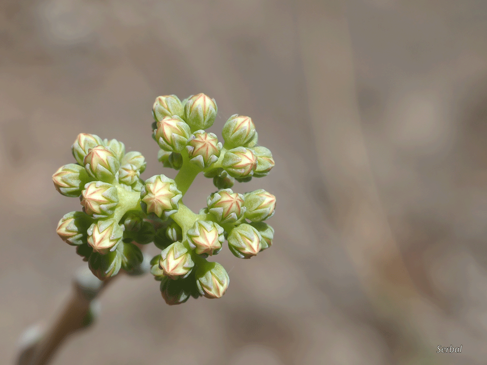 La inflorescencia se coloca al final de un largo escapo cubierto de pequeñas hojas caedizas, es una inflorescencia radial, en cada radio se dispone una veintena de flores, las flores no tienen brácteas y si un corto peciolo; el cáliz está formado por 5 sépalos triangulares, sobre él cinco pétalos de color amarillo pálido a amarillo cremoso, sobre ellos 10 estambres con filamentos blancos y anteras amarillas, en el centro 5 carpelos engrosados con extremo delgado que generaran el fruto.