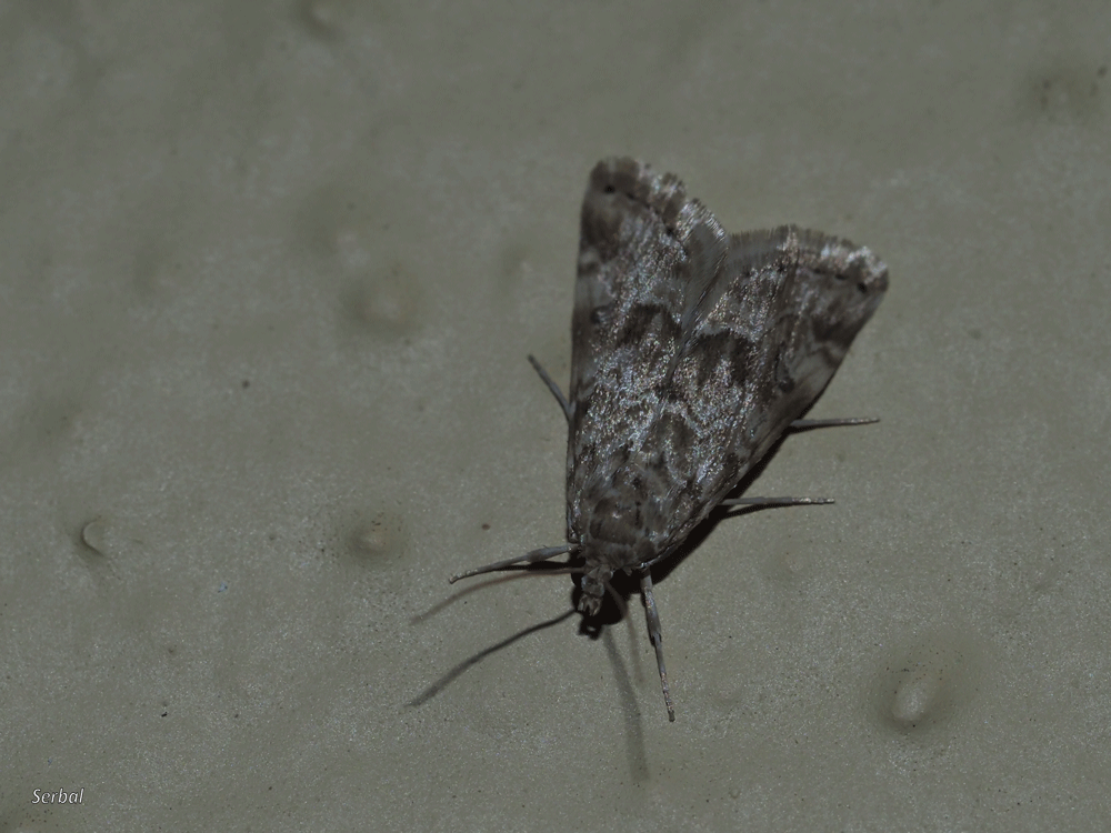 5-6 mm. Pequeña mariposa de la familia Crambidae; es originaria de Europa occidental, desde aquí se ha extendido a la mayor parte del mundo de clima cálido, considerándose hoy cosmopolita; presente en la mayor parte de la Península Ibérica.