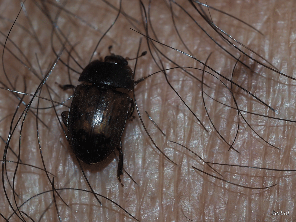 Escarabajo con antenas acabadas en maza y primer artejo ensanchado; cabeza con grandes ojos negros; pronoto trapezoidal con ángulos agudos atenuados y borde posterior sinuoso; élitros de color general negro parduzco con el tercio final más oscurecido donde se dibujan algunas manchas blancas, zona media elitral aclarada así como los hombros, zona próximal media oscurecida; sobre las zonas aclaradas se observan puntos y algunos trazos oscuros; el contorno del pronoto y los élitros tienen un tono ambarino.