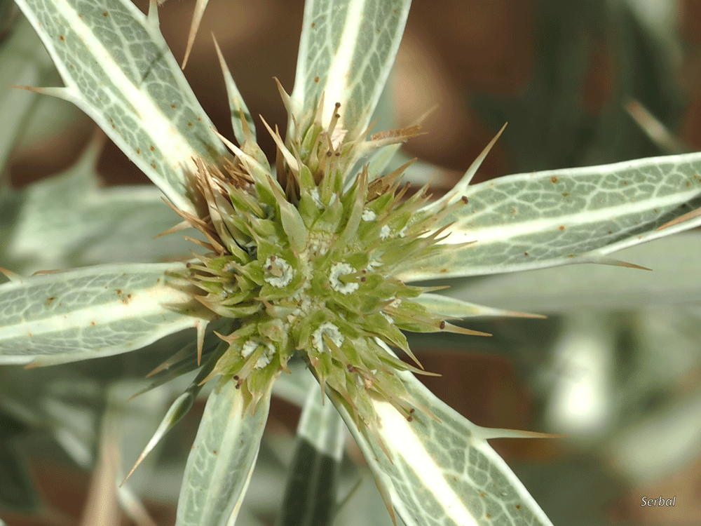 La inflorescencia es tipo umbela compuesta (dicasios o pleocasios), cada radio lleva a un capítulo formado por decenas de pequeñas flores sobre un disco; cada capítulo tiene en la base una corona de 5-6 brácteas desiguales lanceoladas y con espinas laterales, dentro del disco cada pequeña flor tiene 5 bracteolas, acompañadas además de bracteolas sueltas y punzantes entre las flores, de forma defensiva, contorno de la flor 5 sépalos acabados en ápice agudo, dentro 5 pétalos blancos y curvados externamente, dentro 5 estambres pálidos con filamento largo y anteras blancas, en el centro dos estilos; esta inflorescencia tiene un color verdoso pálido, no mostrando el color azulado tan conocido de este género en otras especies.