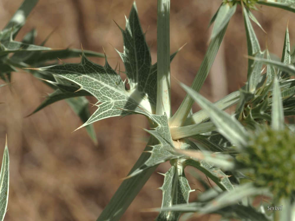 Las hojas caulinares son más pequeñas, se insertan en la base de las bifurcaciones de los tallos, son hojas sin pecíolo (sentadas) pinnatisectas con un lóbulo central lanceolado y dos laterales opuestos en la base, los lóbulos tienen espinas en los laterales y una mayor en el ápice.