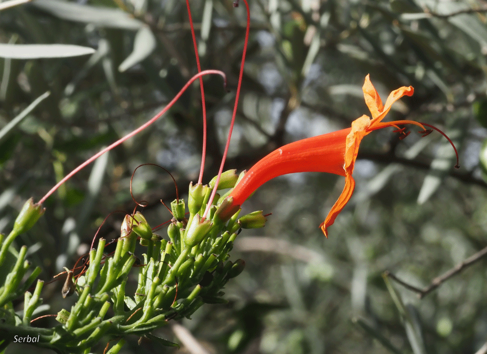 Las flores aparecen al final de los tallos, son hermafroditas, agrupadas en racimos con un par de decenas de flores; cada flor tiene un pequeño pedúnculo, cáliz en forma de copa y acabado en 5 dientes cortos; dentro una corola tubular algo arqueada formada por 5 tépalos naranjas que se abren en el extremo formando 5 lóbulos; dentro 4-5 estambres con filamentos largos de color amarillo y anteras marrón rojizo que forman una V invertida, en el centro un estilo con filamento rojo y estigma discretamente lobulado.