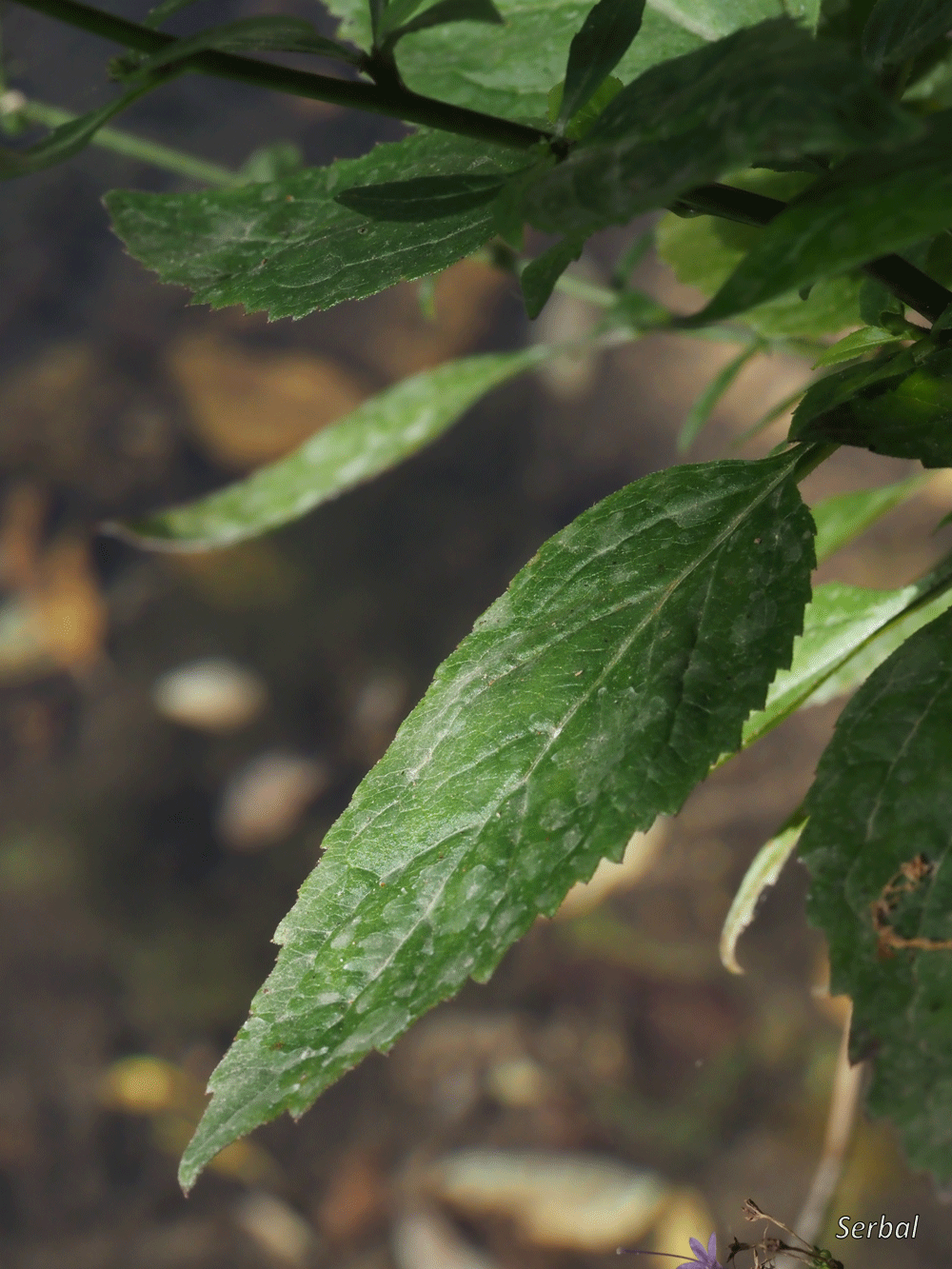 Las hojas basales en roseta, las caulinares se agrupan 3-4 hojas en las axilas y bifurcaciones del tallo, donde una hoja grande sirve de base a 2-3 pequeñas, estas agrupaciones se disponen de forma alterna en el tallo; las hojas grandes miden hasta 10 cm de longitud, pecíolo corto, tiene forma oblonga o acorazonada, las inferiores más grandes y las superiores más pequeñas, el borde foliar está 1-2 veces aserrado y puede tener vello, la nervación gira a rojiza con el tiempo.