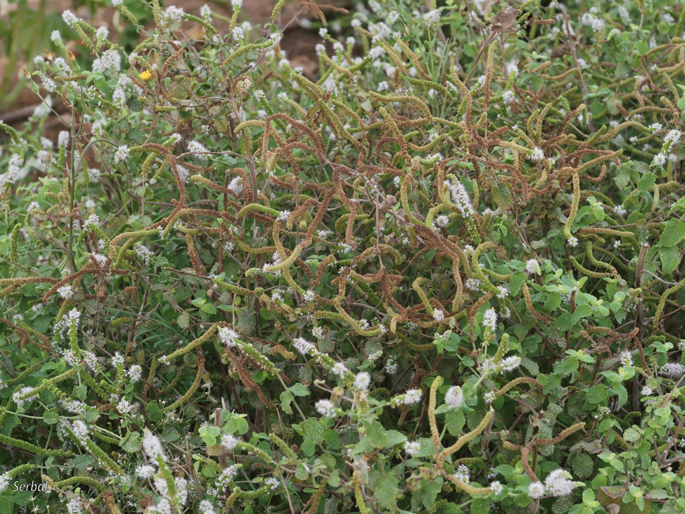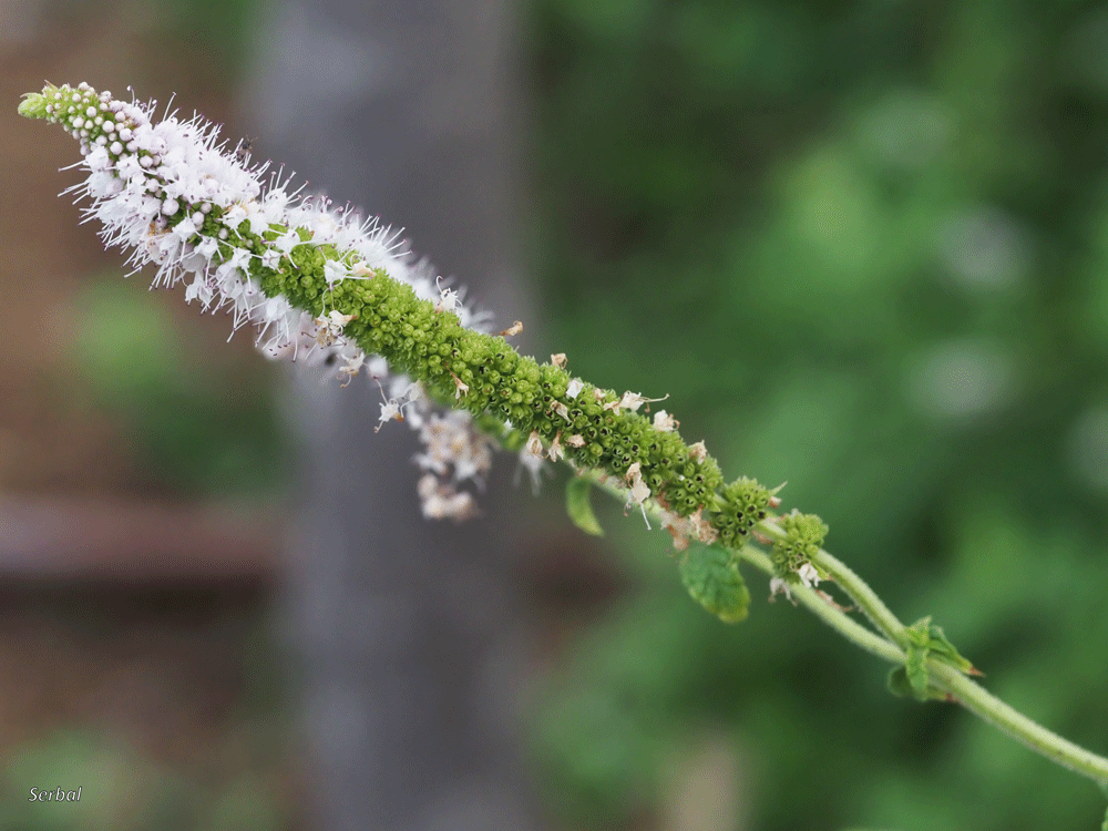 Las flores se agrupan en una inflorescencia terminal ramificada formada por espigas, estas espigas miden unos 8-9 cm de longitud y contiene múltiples pequeñas flores apretadas; cada flor tiene un cáliz verde acabado en 5 dientes, sobre él una corola tubular de color blanco rosado, la corola se abre en el extremo por dos pequeños labios, uno superior y otro inferior, el inferior se divide en 3 lóbulos, dentro de la corola 4 estambres exertos con filamento blanco y anteras moradas, finalmente un estilo pálido rosado con estigma discretamente bífido.
