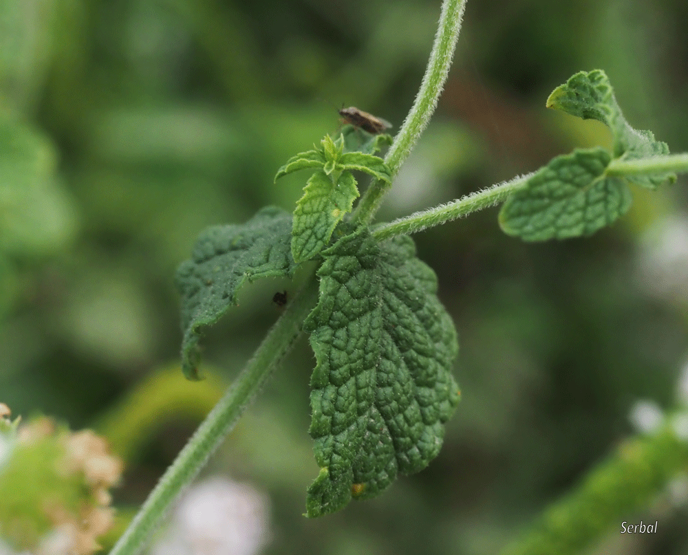 Hojas redondeadas a oblongas de superficie rugosa y con vello blanquecino, se disponen en pares opuestos, pecíolo ausente o muy corto, el borde foliar tiene pequeños dientes que se disimulan por tener el borde curvado hacia dentro, color verde oscuro, miden unos 3-4 cm de diámetro.