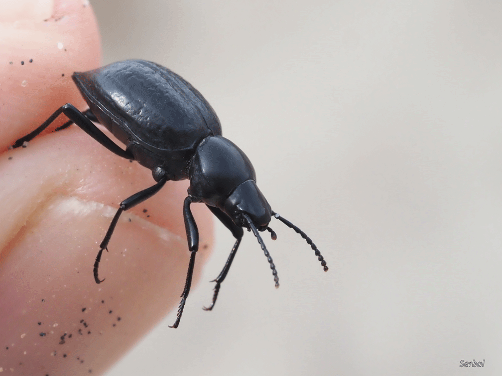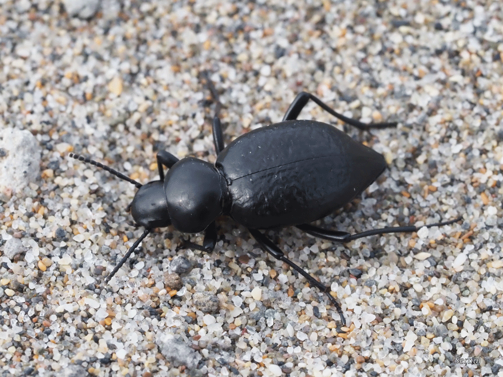 Escarabajo fotografiado en Cabo de Gata (Almería), sobre la arena próxima a la costa, deambulando a media mañana; octubre 2025.