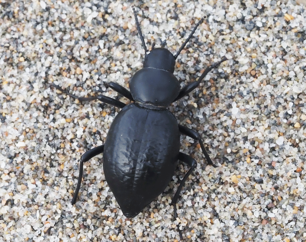Escarabajo fotografiado en Cabo de Gata (Almería), sobre la arena próxima a la costa, deambulando a media mañana; octubre 2025.