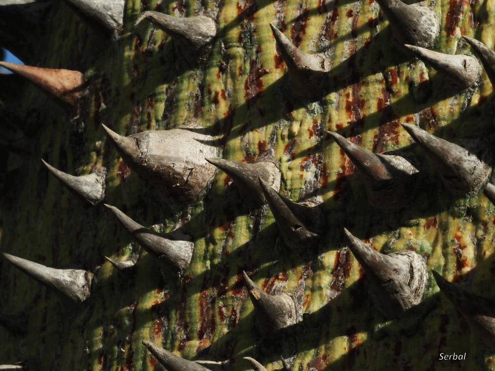 Tronco grueso que se ensancha especialmente en la zona media, pudiendo alcanzar hasta un metro de anchura, ramas primarias con menor diámetro en los extremos y las secundarias cortas y grosor mantenido; el color del tronco verde grisáceo con estrías verticales y arrugas horizontales; destacan en el tronco grandes púas cónicas y leñosas, a veces, curvadas; copa abierta redondeada.
