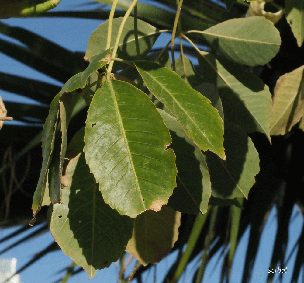 Hojas alternas, grandes, con largos pecíolos de hasta 12 cm de longitud, están compuestas por 5 foliolos oblongos de color verde y borde aserrado irregularmente; color verde brillante por el haz y más claro por el envés.