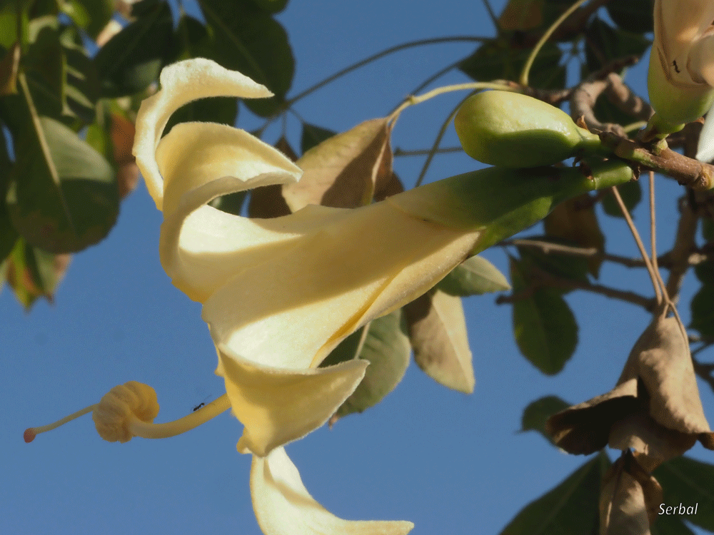 Las flores se insertan al final de las ramas secundarias; solitarias o grupos de 2-3 flores, color blanco cremoso, grandes de unos 8-15 cm de longitud y forma campanulada; se componen de un cáliz verde amarillento, dentro 5 pétalos blanco amarillentos (a veces manchados de púrpura) sedosos unidos por la base, dentro 5 estambres unidos por los filamentos y formando una corona blanquecina con las anteras, un estilo central que emerge entre la corona de anteras formada con estigma rosado globoso.