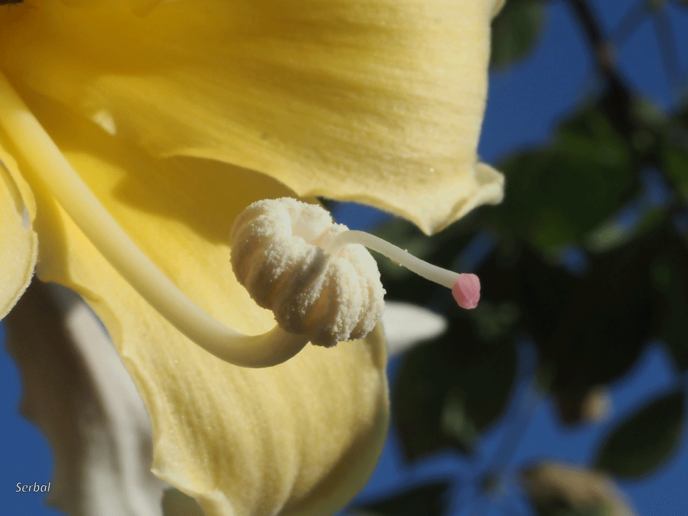 Las flores se insertan al final de las ramas secundarias; solitarias o grupos de 2-3 flores, color blanco cremoso, grandes de unos 8-15 cm de longitud y forma campanulada; se componen de un cáliz verde amarillento, dentro 5 pétalos blanco amarillentos (a veces manchados de púrpura) sedosos unidos por la base, dentro 5 estambres unidos por los filamentos y formando una corona blanquecina con las anteras, un estilo central que emerge entre la corona de anteras formada con estigma rosado globoso.