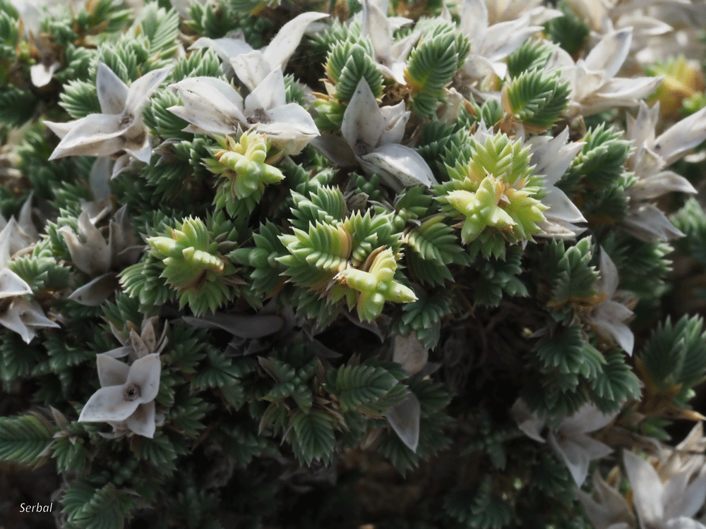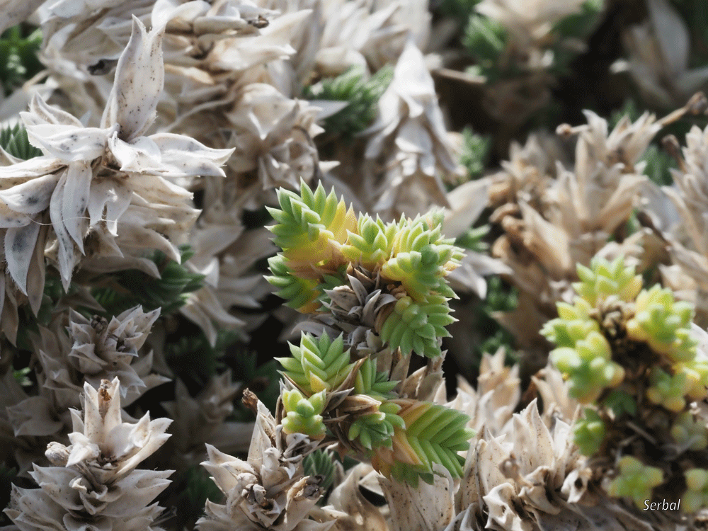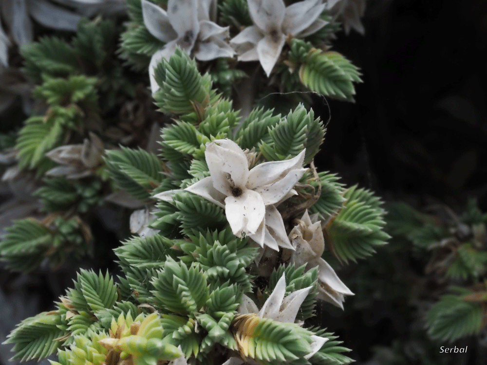 Las hojas se agrupan en verticilos de 4, son hojas que se acompañan de una bráctea superpuesta cada una formando una unidad, son hojas imbricadas con forma oblongolanceolada terminadas en mucrón, borde coriáceo, blanquecino con nervio grueso por el envés; la disposición de las hojas permite conservar y retener la humedad.