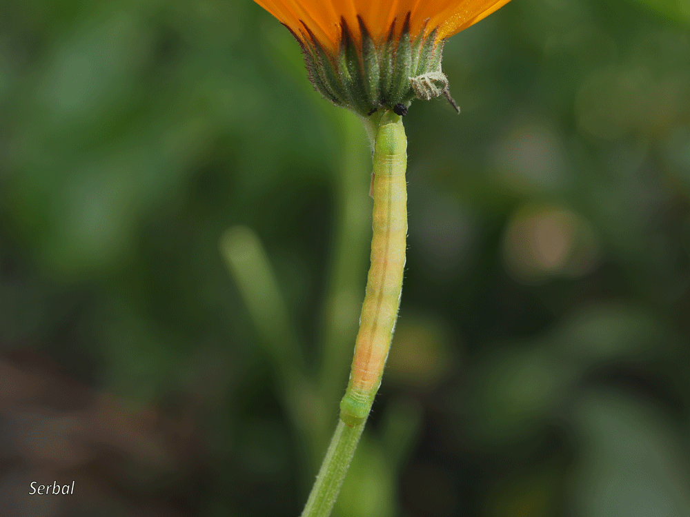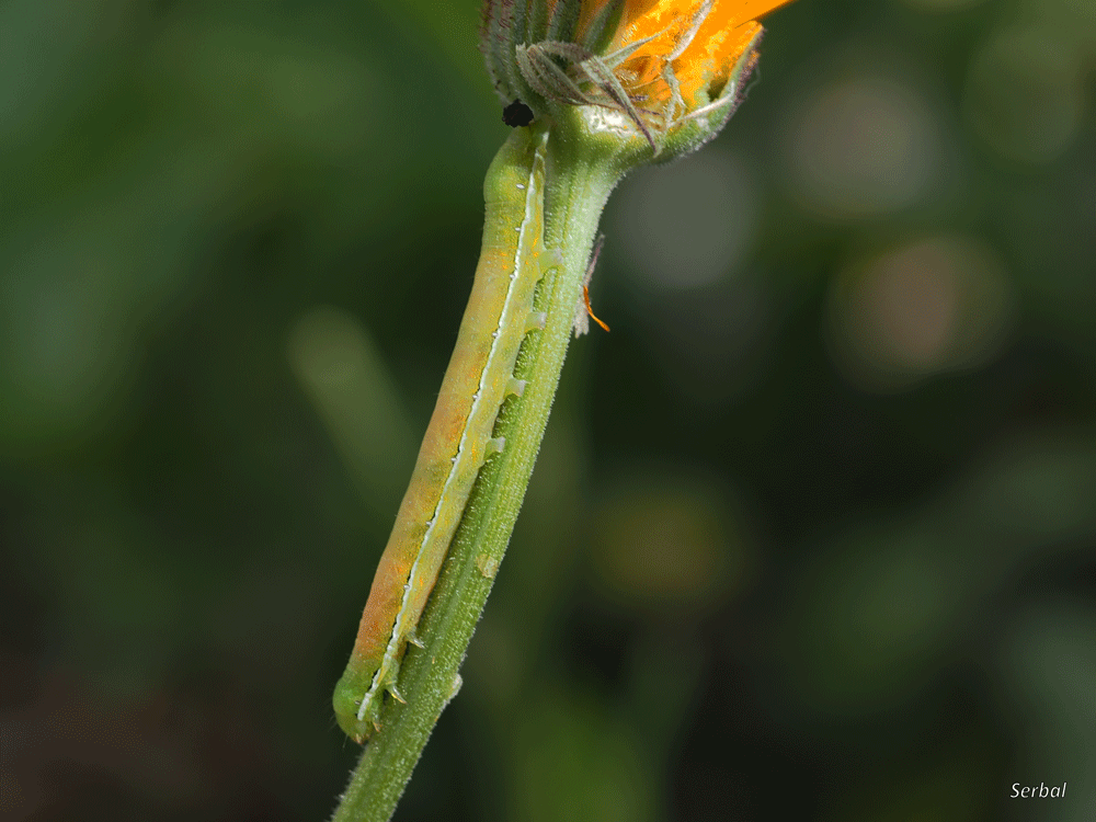 Las orugas se alimentan de las hojas de distintas plantas arbóreas y arbustivas de hoja caduca, también de algunas herbáceas; son orugas verdes con manchitas pálidas amarillentas, destacan línea dorsal amarillenta, otra subdorsal poco definida y una espiracular bien definida, amarillenta manchada de negro en zona superior y con espiráculos blancos bordeados de negro.