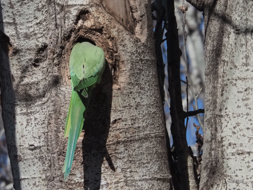 Este ejemplar está fotografiado en un parque de Madrid, donde inspeccionaba el nido (abandonado de pájaro carpintero) donde sacará a sus pollos adelante, febrero 2026.