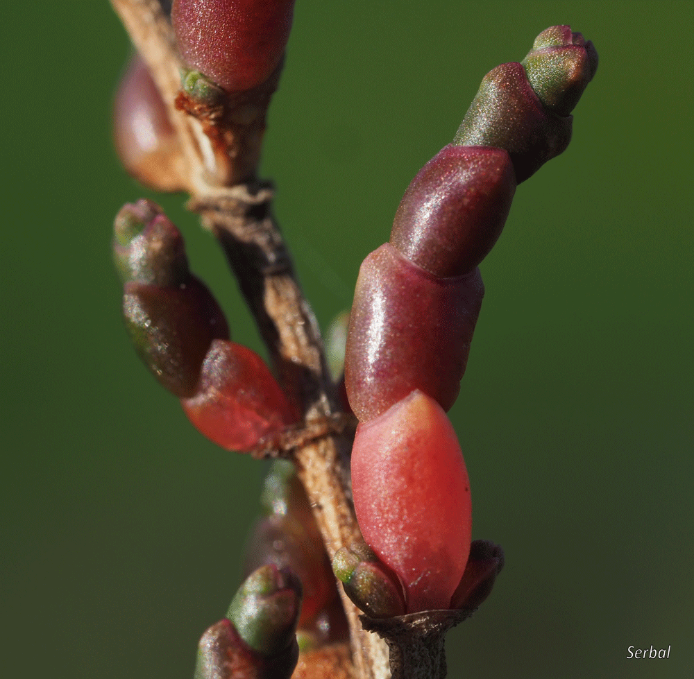 Arbusto formado por gran ramificación en la base, lo que crea múltiples tallos postrados o ascendentes paralelos, rígidos y generalmente tortuoso; hay dos tipos de tallos los estériles (más cortos) y los fértiles (más largos); tallos formados por segmentos articulados carnosos o leñosos (los viejos) de color verde o rojizo con el paso del tiempo.