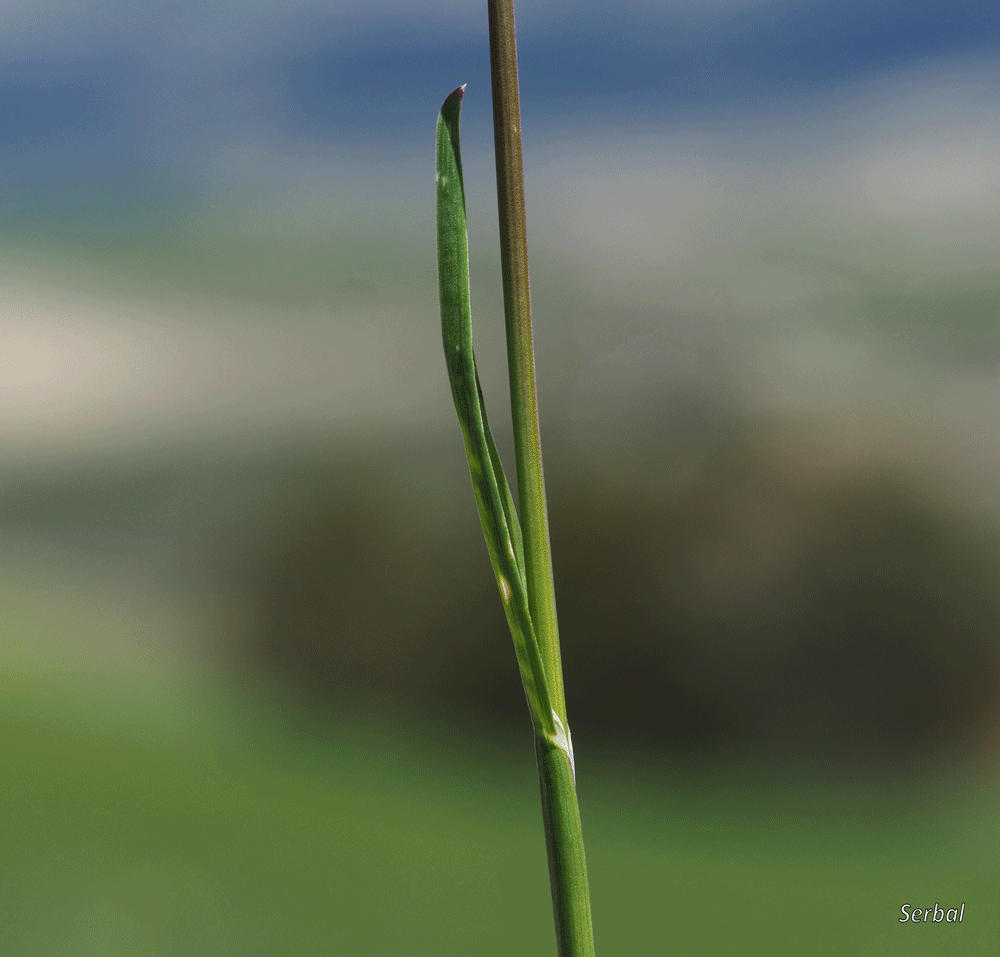 Las hojas no tienen aurículas, pero si lígula membranosa de color grisáceo; hojas con base envainante y limbo plegado antes de abrirse, limbo con los bordes paralelos y acabado en una quilla, nervio central acompañado por una línea deprimida a cada lado que lo acompañan, forma general del limbo acanalado; color verde claro.