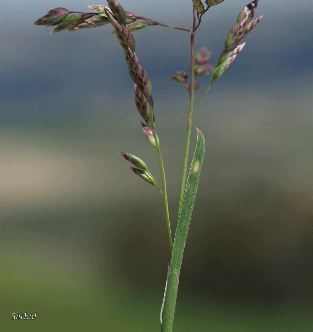Las flores se disponen en una panícula laxa con pedúnculo y raquis finos y sin vello, el raquis se presenta, a veces, ondulado; flores agrupadas en espiguillas con 2-8 flores cada una, glumas desiguales que no llegan a cubrir las flores, gluma inferior con un nervio y superior con tres nervios, borde coriáceo y tonos morados rosados; lemas aquilladas (comprimidas lateralmente) sin aristas con nervios pelosos; cada flor tiene 3 estambres con anteras amarillas y dos estilos con estigmas pelosos.