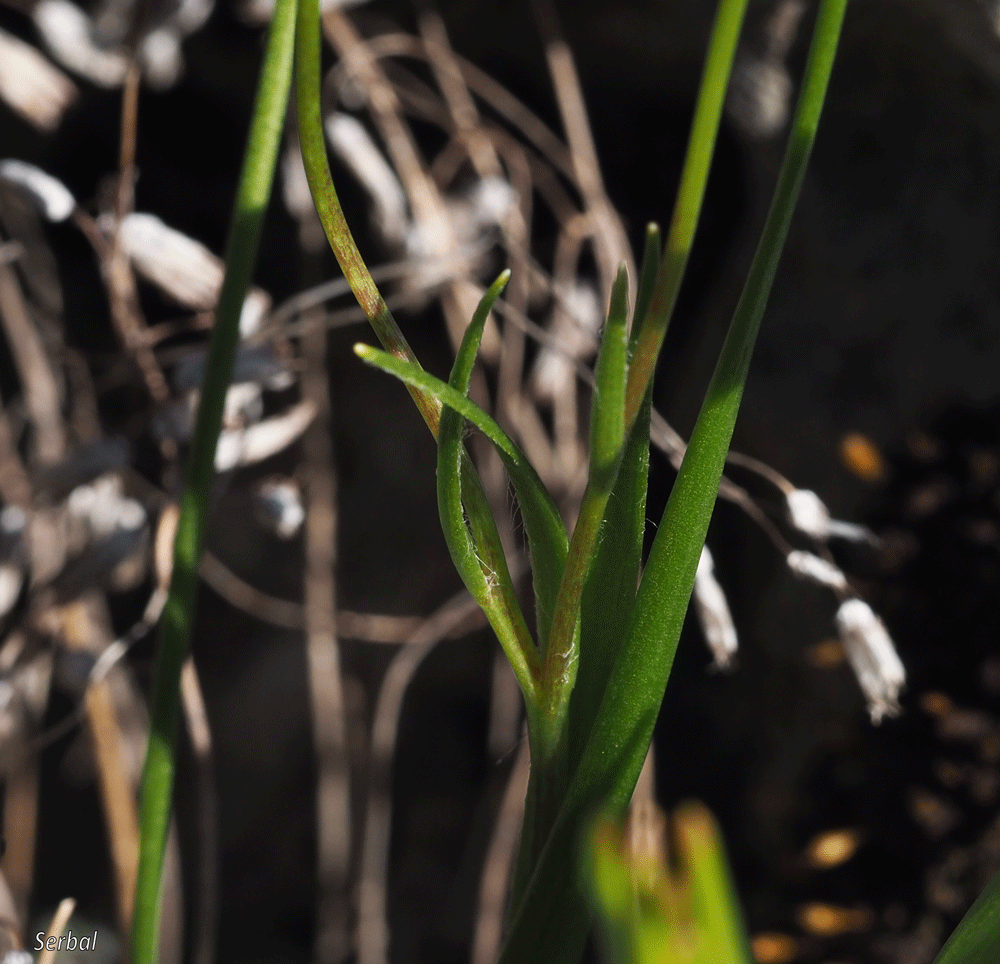 Tiene un par de hojas basales con forma filiforme y aspecto más robusto que las caulinares; desde la base emerge un tallo delgado donde se aprecian dos hojas caulinares con forma filiforme, estas hojas caulinares pueden tener vello blanquecino largo; el tallo se divide en varios pedúnculos florales.