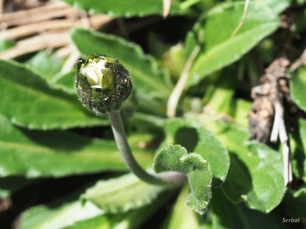 Las flores son capítulos solitarias y emergen al final de largos pedúnculos (escapos) que se insertan en el centro de la roseta basal, tiene un color verde (a veces tono rojizo) y vello corto que le dan un aspecto grisáceo; la base de la flor tiene dos filas de brácteas, esta son de color verde oscuro, dorso engrosado y con vello patente, extremo desde agudo a romo; dentro del disco encontramos múltiples flores, las periféricas son femeninas y con lígulas blancas con algo de rosado en el envés (aparentes pétalos), las restantes son flosculosas (tubo largo y estrecho) y hermafroditas de color amarillo, estas flores hermafroditas poseen dentro del tubo 5 estambres fusionados por los filamentos y forman un tubo por el que emerge el estilo; los estambres maduran antes que el estilo, lo que permite que los insectos llevan al polen a otras flores, y posteriormente, cuando madure el estilo, este sea polinizado por el polen de otras flores (polinización cruzada).
