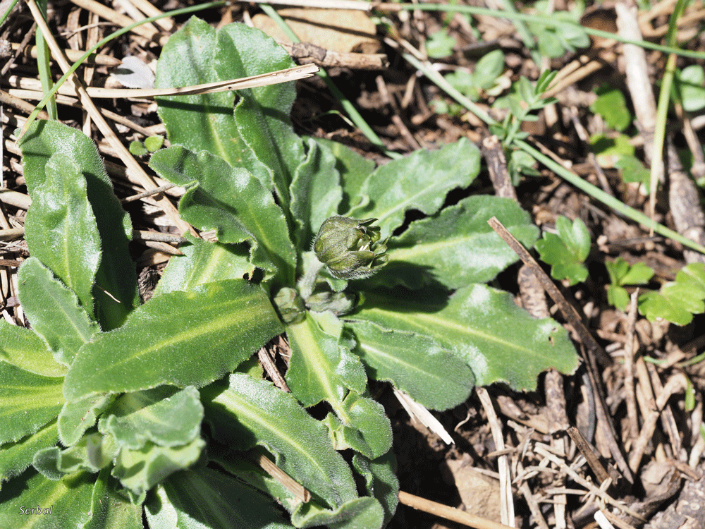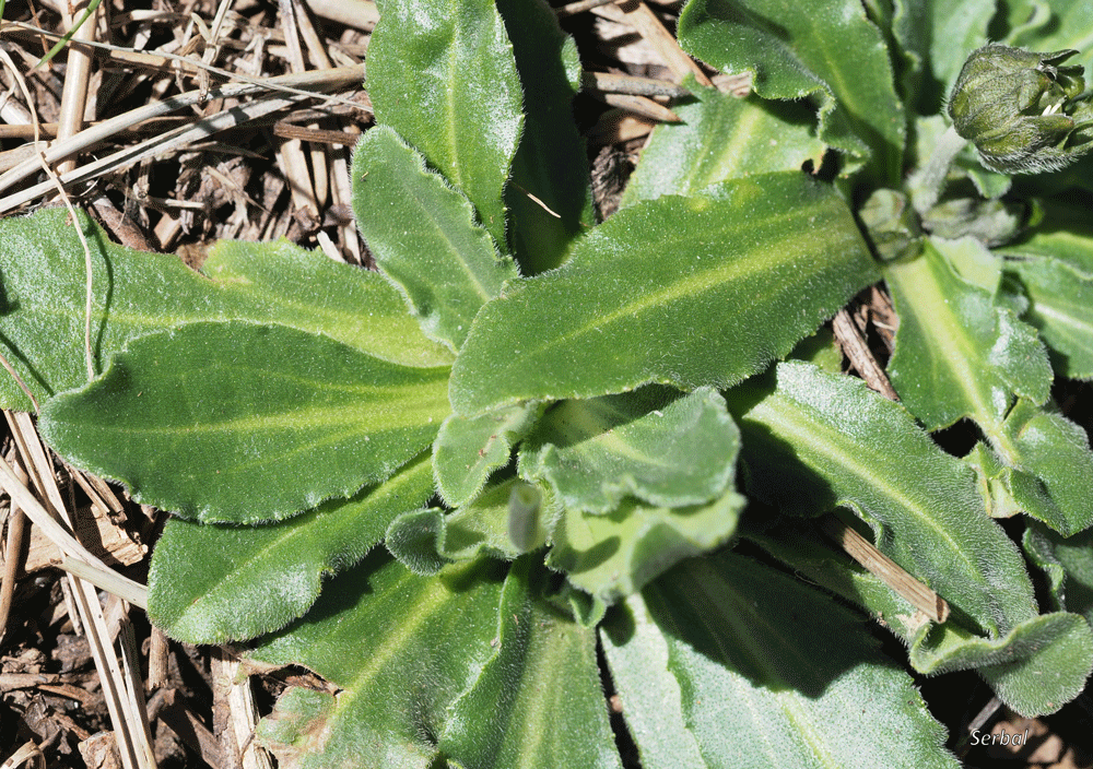 Las hojas son todas basales, se disponen en roseta basal, son hojas de unos 5 cm, con forma desde linear hasta oblongas o espatuladas, tiene vello corto blanquecino, borde foliar con pequeños dientes blanquecinos, las hojas se disponen prostradas, en el reverso destaca un nervio central y dos paralelos que se estrechan antes de llegar al ápice.