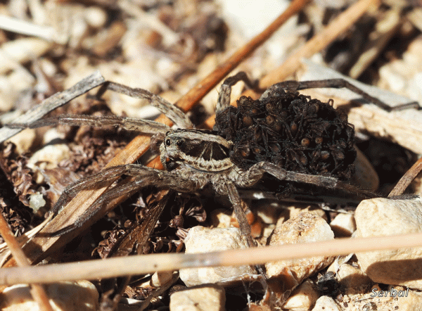 Machos hasta 1.8cm y las hembras hasta 2.5cm. Familia Lycosidae.Araña grande de color gris, con el prosoma dividido por dos líneas longitudinales negras, atravesadas por …