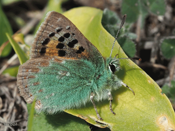 2\’2-2\’8 cm. Mariposa diurna muy pequeña de la familia Lycaenidae; se distribuye por las sierras del sur de la Península Ibérica, en forma de colonias …