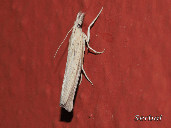 20 mm de envergadura. Pequeña polilla de la familia Crambidae; se distribuye por la región mediterránea occidental; en la Península Ibérica está presente en las …