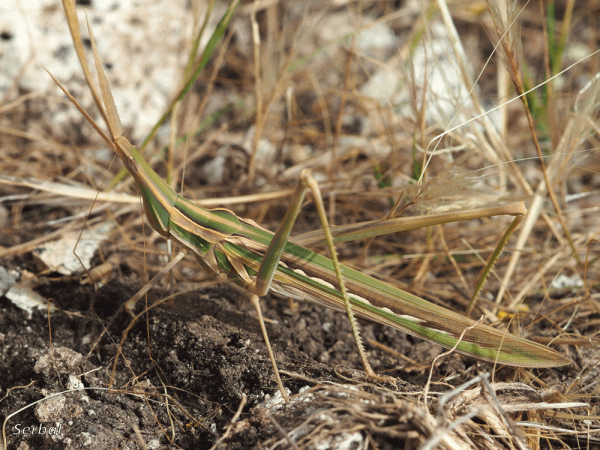 40-45 mm, los machos más pequeños. Saltamontes de la familia Acrididae que se distribuye por los países ribereños del Mediterráneo, normalmente en lugares cálidos cerca …