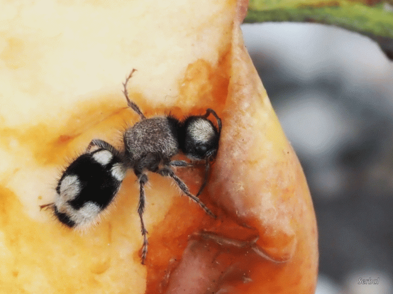 10-20 mm. Himenóptero de la familia Mutillidae que se distribuye por toda la Europa meridional, Asia occidental y Marruecos; frecuente en las zonas más cálidas de la Península Ibérica. Insecto que vemos en el suelo andando sin cesar, aspecto de hormiga aterciopelada y con patrón de color peculiar. La hembra tiene la cabeza negra con mancha gris en el dorso, …
