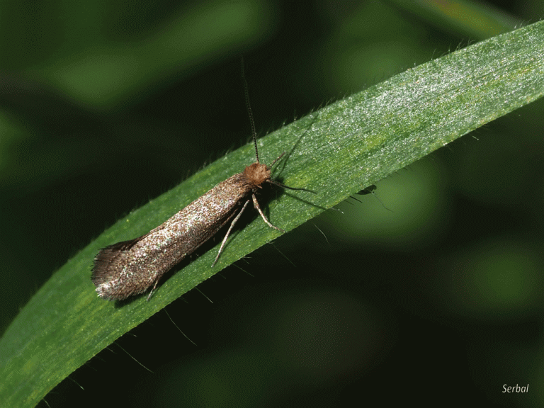 15 mm de envergadura alar. Micropolilla de la familia Tineidae; es un endemismo de la Península Ibérica; principalmente área próxima al mediterráneo, con algunas citas en el centro peninsular. Mariposa de tono uniforme color marrón plateado; extremos de las alas elevados mostrando las fimbrias y formando cuerpo ahusado; sobre la cabeza vello largo de color marrón rojizo; antenas largas y …