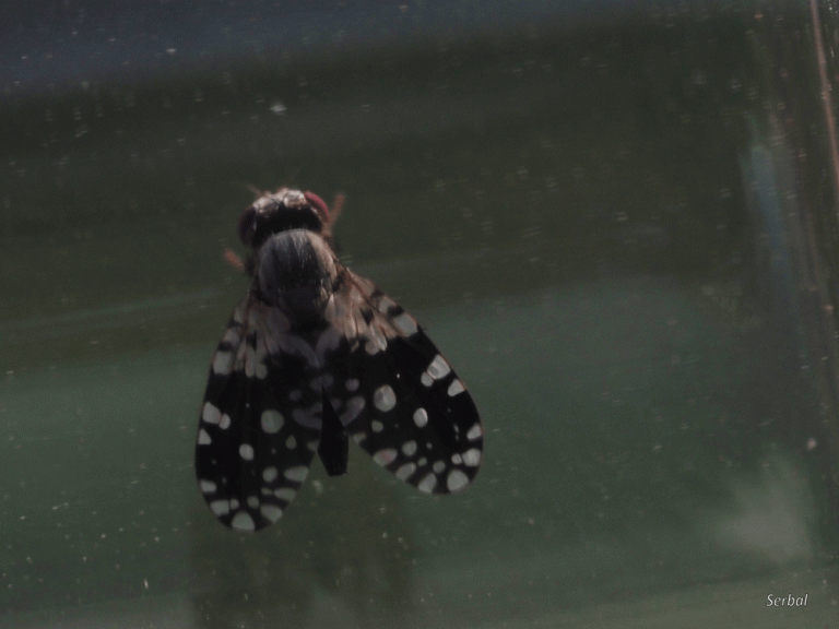 4 mm. Pequeña mosca de la familia Tephritidae; se distribuye por el área mediterránea del sur de Europa con citas desde la Península Ibérica hasta Oriente Próximo; área mediterránea y sur peninsular. Mosca con cabeza ancha con grandes ojos rojos; tórax de color gris con tres finas líneas longitudinales en dorso del tórax; hembras con abdomen acabado en cono (ovopositor) …