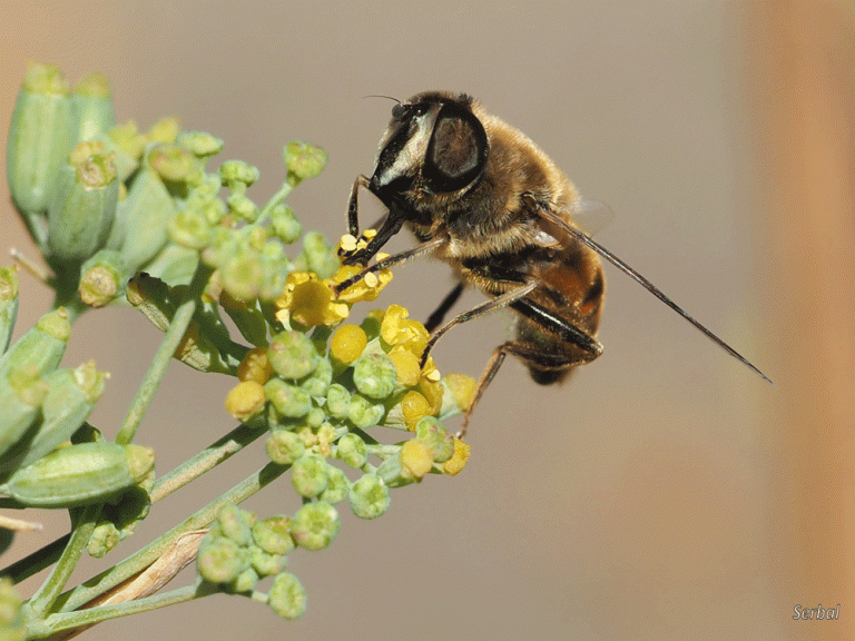 6-9 mm. Sírfido de la familia Syrphidae de distribución Holártica, repartido ampliamente por Eurasia y norte de África. Habita herbazales y praderas con abundantes flores, normalmente cerca de zonas arboladas o con arbustos, también en huertos y jardines, siempre que haya pulgones. Macho con ojos juntos, abdomen fino y largo terminado en bola (Mosca pluma) y la hembra con ojos …